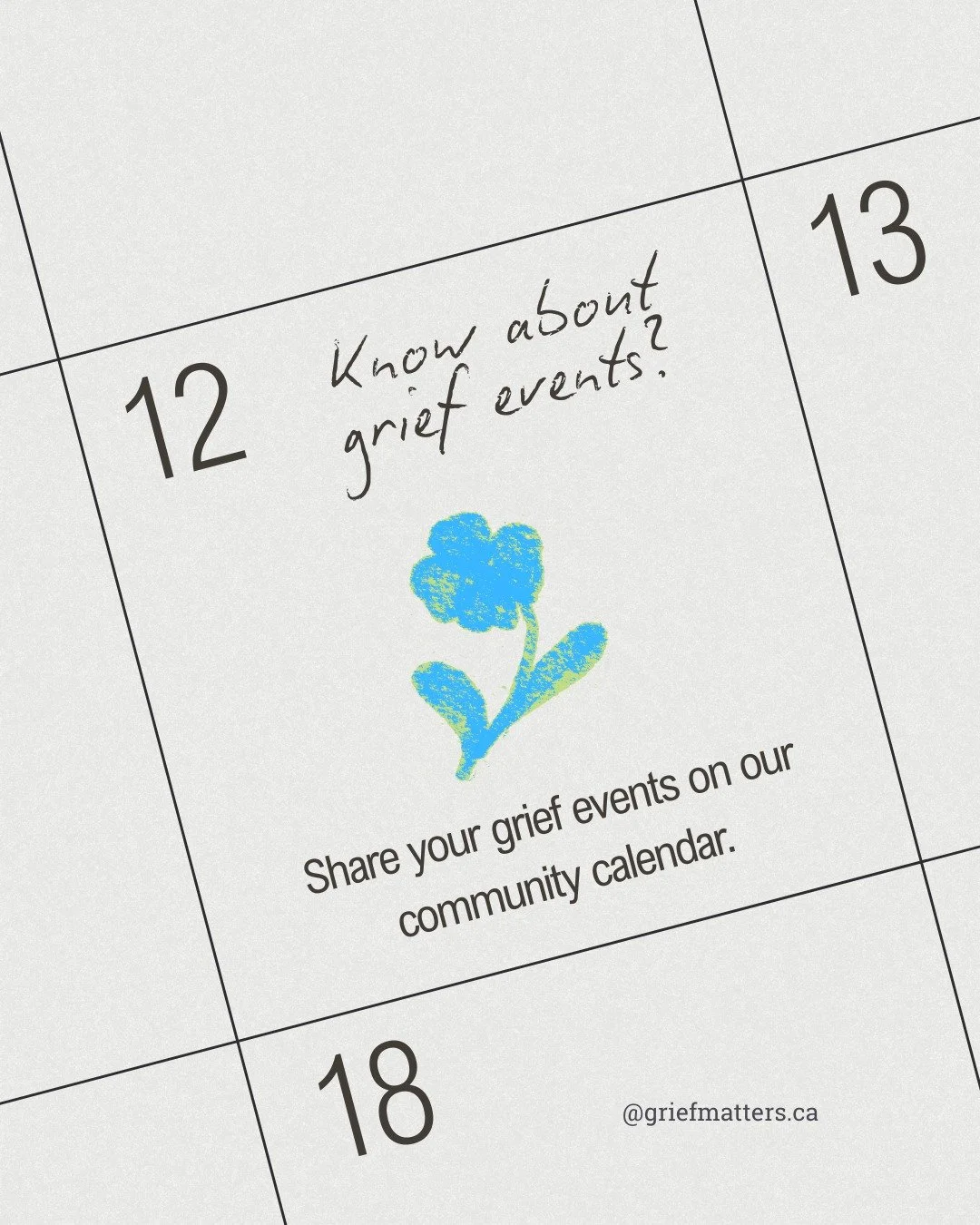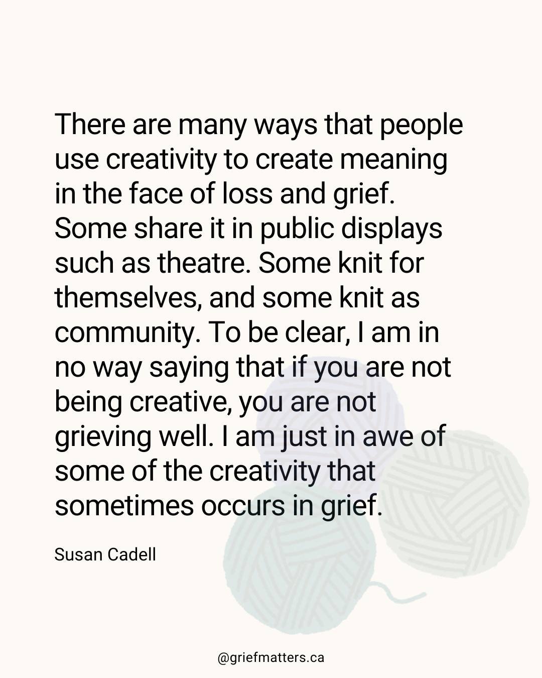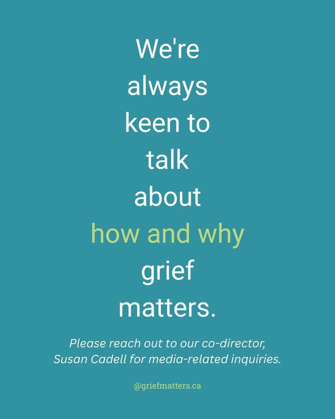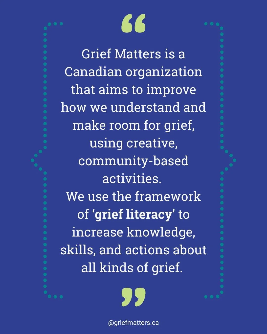 Grief Matters is a Canadian organization working to help all of us - from individuals to all of society - to better understand and make room for grief, through creative, community-based activities. All grief is welcome here. Come learn with us!