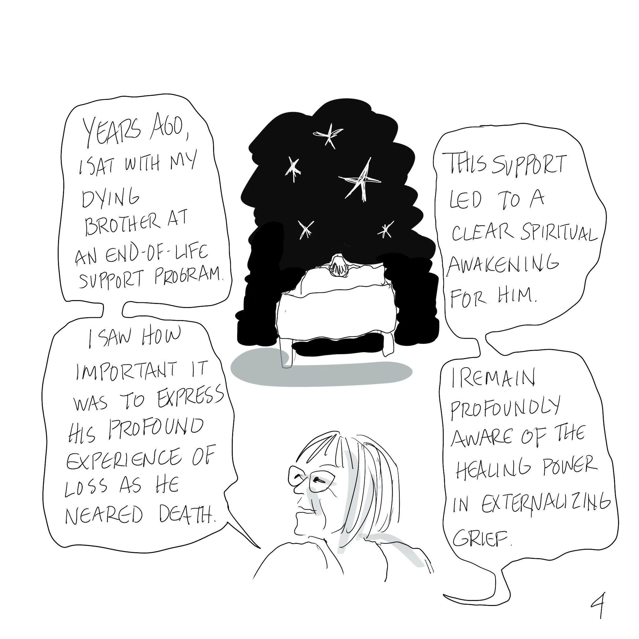 Susan MacLeod is a Nova Scotian artist writing and drawing about health care issues. Her humorous book, Dying for Attention: A Graphic Memoir of Nursing Home Care, follows her nine-year journey shepherding her mother through a callous long-term care system. This inspired her interest in end-of-life and grief issues.