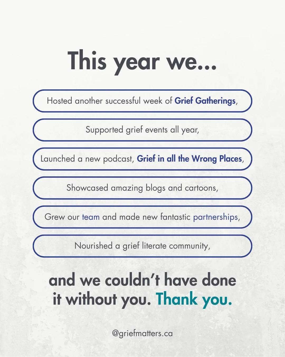 Grief Matters started in 2023 from a passion project. Our team has grown to include multiple identities, geographies, skills, and experiences. We are: community members, academics, artists, social media experts, Nova Scotians, Ontarians, family members, caregivers, and grievers. We bring together a unique balance of perspectives to think passionately and critically about what grief is and how grief should be integrated into our many communities. We want to keep learning through everything Grief Matters does.